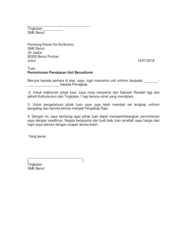 Surat permohonan pertukaran unit beruniform in english surat permohonan pertukaran unit beruniform pengakap surat permohonan pertukaran unit beruniform bawah surat. Surat permohonan menubuhkan pasukan pakaian seragam kelabpersatuan dan kelab sukanpermainan daripada gurumurid disertakan bersamaa draf perlembagaan draf aktiviti. Contoh kertas kerja permohonan tanah.